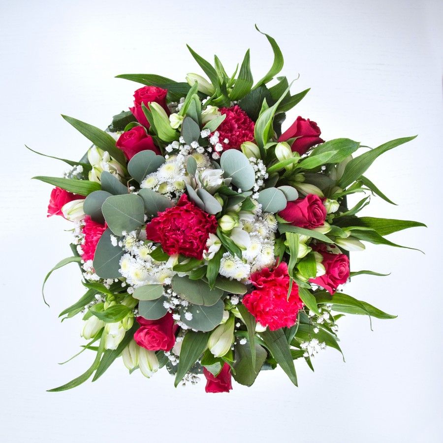 Immerse yourself in the vibrant allure of our luxurious bouquet, designed to spark creativity and delight the senses. This enchanting arrangement beautifully blends sweet white chrysanthemums with delicate gypsophila, paired with the passionate flair of red roses and carnations. Complemented by subtle touches of white alstroemeria and the lush elegance of aspidistra leaves, every petal contributes to a harmonious display of color and texture.