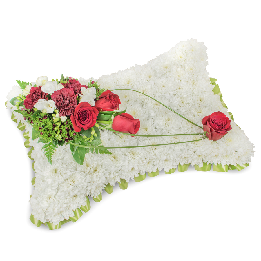 Express your condolences with our classic sympathy flower arrangement, designed to offer comfort and timeless beauty. This elegant bouquet features a harmonious combination of white chrysanthemums, red roses, white freesias, dark red carnations, dianthus, and bear grass, carefully arranged to create a dignified and respectful display.