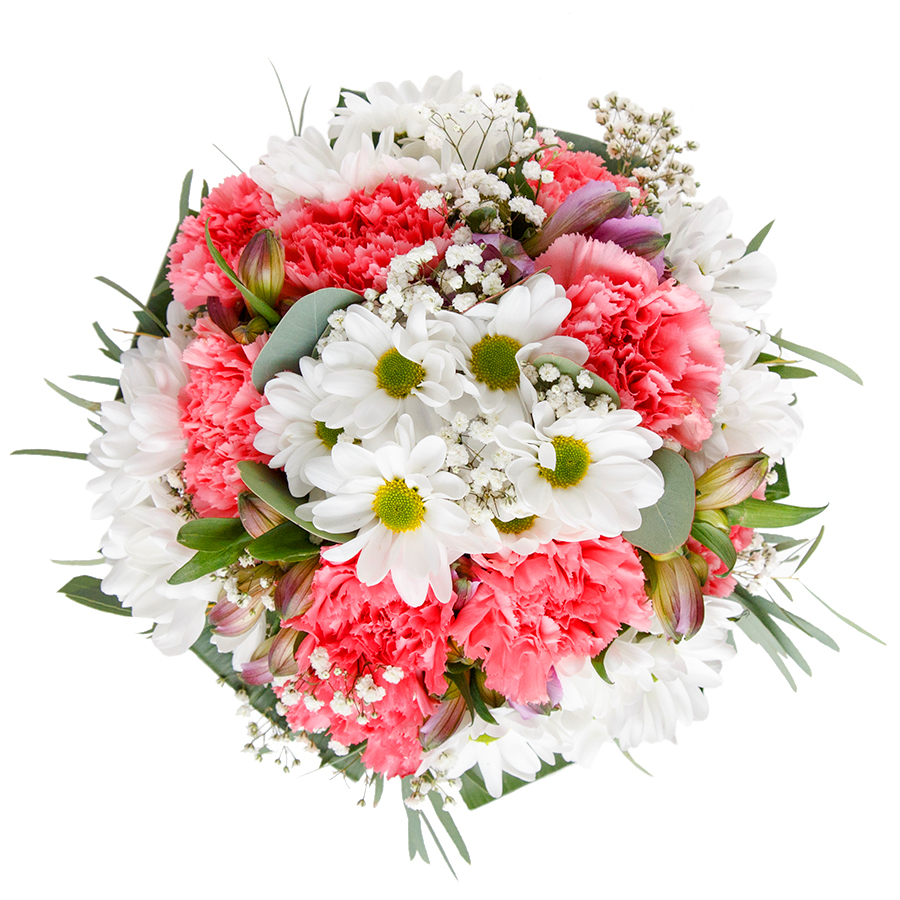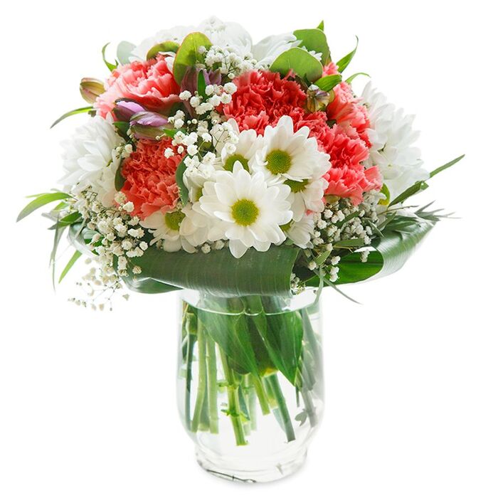 Our exquisite seasonal arrangement is a celebration of natural beauty and meticulous craftsmanship. Featuring a delicate mixture of snow-white chrysanthemums, whimsical gypsophila, and charming light pink carnations, complemented by vivid aspidistra leaves, this bouquet is designed to captivate and inspire. Each flower is hand-picked to ensure only the highest quality and freshness are delivered to you.